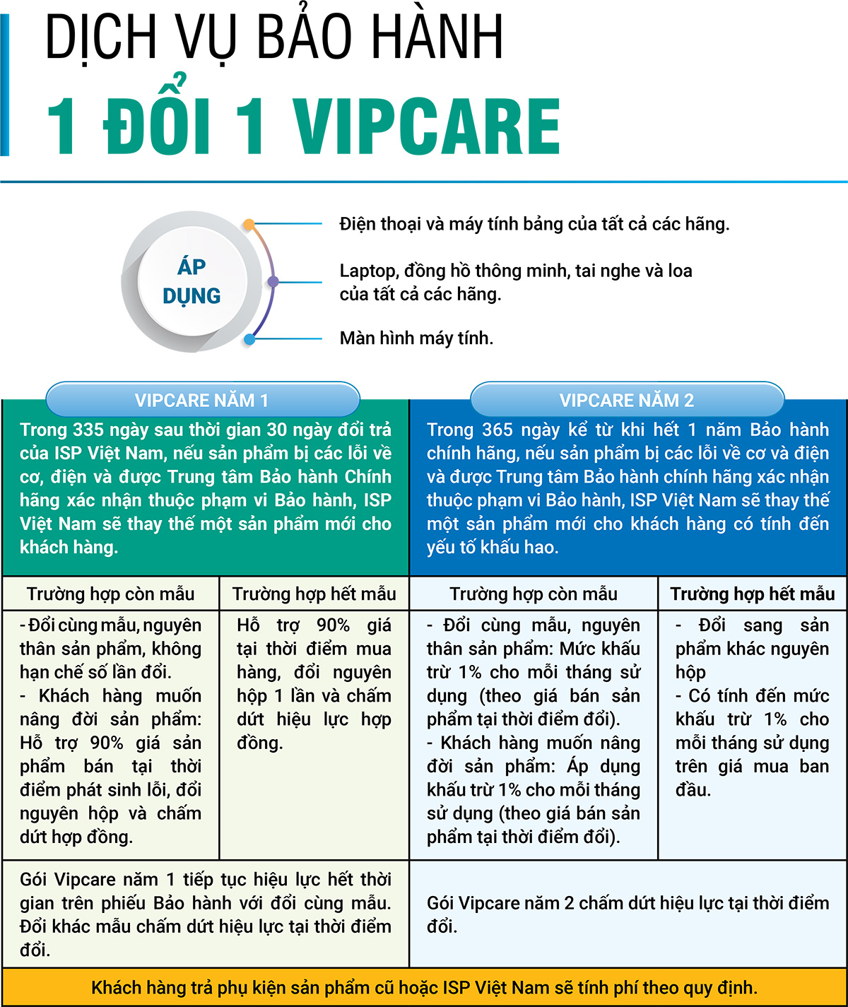 Thấu hiểu được những lo lắng của khách hàng, ISP Việt Nam là đơn vị cung cấp gói dịch vụ bảo hành 1 đổi 1 vô cùng độc đáo. Gói bảo hành 1 đổi 1 tại ISP Việt Nam được chia thành 2 loại gồm: