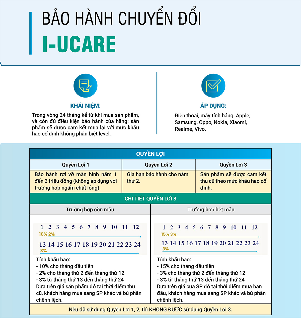 - Trường hợp sản phẩm hết mẫu, không xác định được mức giá tại thời điểm Thu cũ, mức Khấu hao sẽ được điều chỉnh là 15% cho tháng đầu tiên và 3% cho mỗi tháng sử dụng tiếp theo, căn cứ trên giá tại hóa đơn mua hàng của sản phẩm.