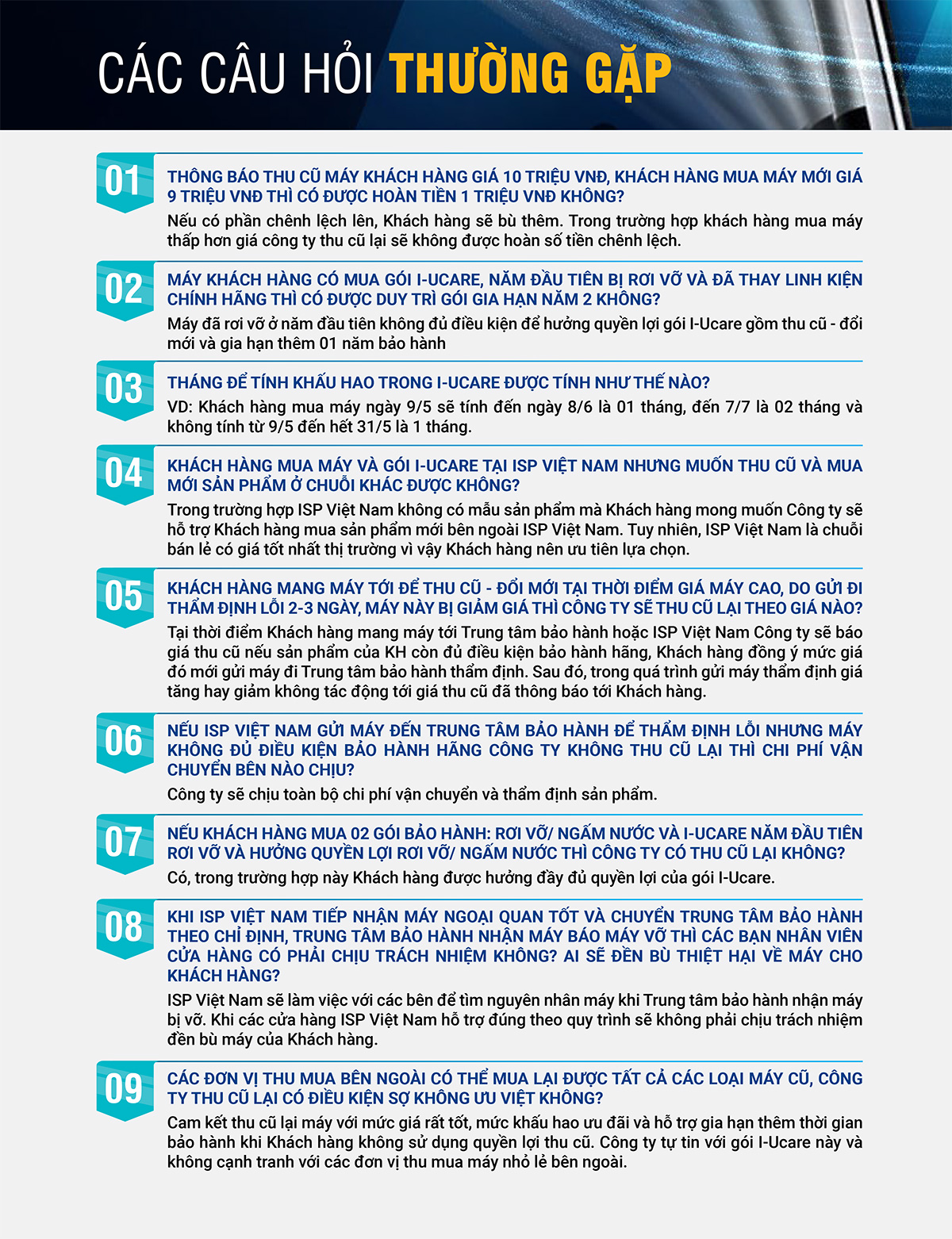 - Trong vòng 24 tháng kể từ khi mua hàng, nếu sản phẩm vẫn còn đủ điều kiện bảo hành của nhà sản xuất (12 tháng đầu) và còn đủ điều kiện bảo hành của ISP Việt Nam (12 tháng tiếp theo) dành cho sản phẩm, ISP Việt Nam cam kết sẽ Thu cũ sản phẩm của khách hàng với mức khấu hao cố định là 10% cho tháng đầu tiên, 2% cho tháng tiếp theo (12 tháng đầu) và 3% cho các tháng sử dụng tiếp theo kể từ tháng thứ 13, tính trên giá của sản phẩm tại thời điểm Thu cũ và Đổi mới một sản phẩm khác cho khách hàng. Khách hàng chi trả khoản tiền chênh giữa giá sản phẩm mới với khoản Thu cũ mà ISP Việt Nam chi trả để được nhận sản phẩm Đổi mới.