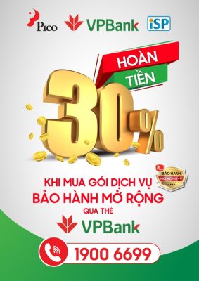 Nằm trong chương trình hợp tác với Pico và Ngân hàng VPBank, khách hàng khi mua gói dịch vụ bảo hành mở rộng của ISP Việt Nam qua thẻ VPBank sẽ được hoàn tiền 30%. Chi tiết liên hệ 1900 6699.